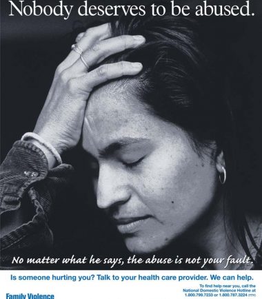 This 17” x 11” poster was designed specifically for health care settings and encourages women to talk to their health care providers about domestic violence. The headline reads: “Nobody deserves to be abused” with subtext: “No matter what he says, the abuse is not your fault. Talk to your health